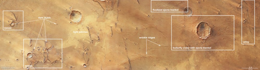 Im Bild dominiert überwiegend flaches Gelände mit einigen dunkel umrissenen Tafelbergen und einem ungewöhnlich aussehenden Einschlagskrater. Die rötlich-braune Oberfläche verdunkelt sich allmählich von Süden (in den Draufsichten links) nach Norden (rechts), und einige hellere, leicht tiefer gelegene Bereiche sind über das Bild verstreut. Letztere gehören gemeinsam mit den linearen Tälern zu einer größeren geologischen Struktur, Idaeus Fossae – ein System von Tälern, nur wenige Kilometer westlich des Bildausschnitts.