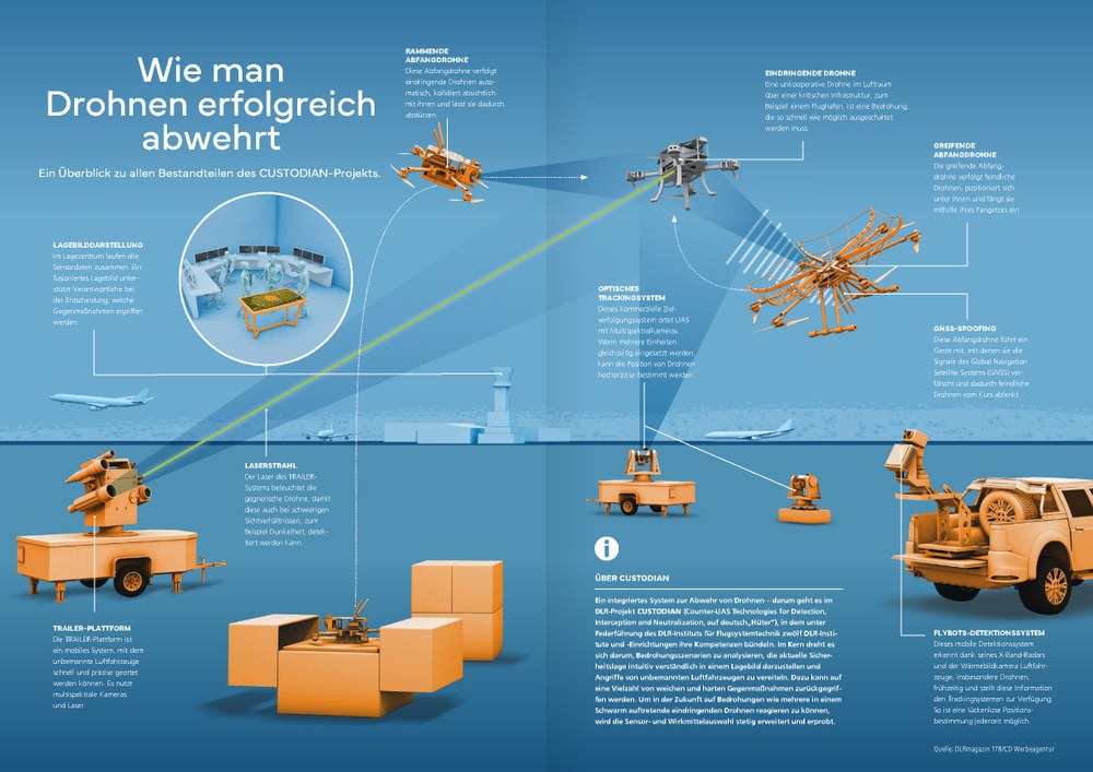 Im Projekt CUSTODIAN (Counter-UAS Technologies for Detection, Interception and Neutralization) bündeln zwölf DLR-Institute und Einrichtungen unter der Leitung des DLR-Instituts für Flugsystemtechnik ihre Kompetenzen zur Drohnenabwehr. Das DLR arbeitet an einer Vielzahl technischer Lösungen. Wissenschaftlerinnen und Wissenschaftler haben im Nationalen Erprobungszentrum für Unbemannte Luftfahrtsysteme des DLR in Cochstedt erfolgreich gezeigt, wie eine feindliche Drohne erkannt und unschädlich gemacht wird. Dabei haben die Forschenden unter anderem eine Drohne durch gezielte Beeinflussung des Navigationssignals zum Landen gezwungen. In einem anderen Szenario wurde eine feindliche Drohne von einer automatischen Abfangdrohne gerammt. Im DLR werden weitere Vorgehensweisen untersucht, um Drohnen unschädlich zu machen.