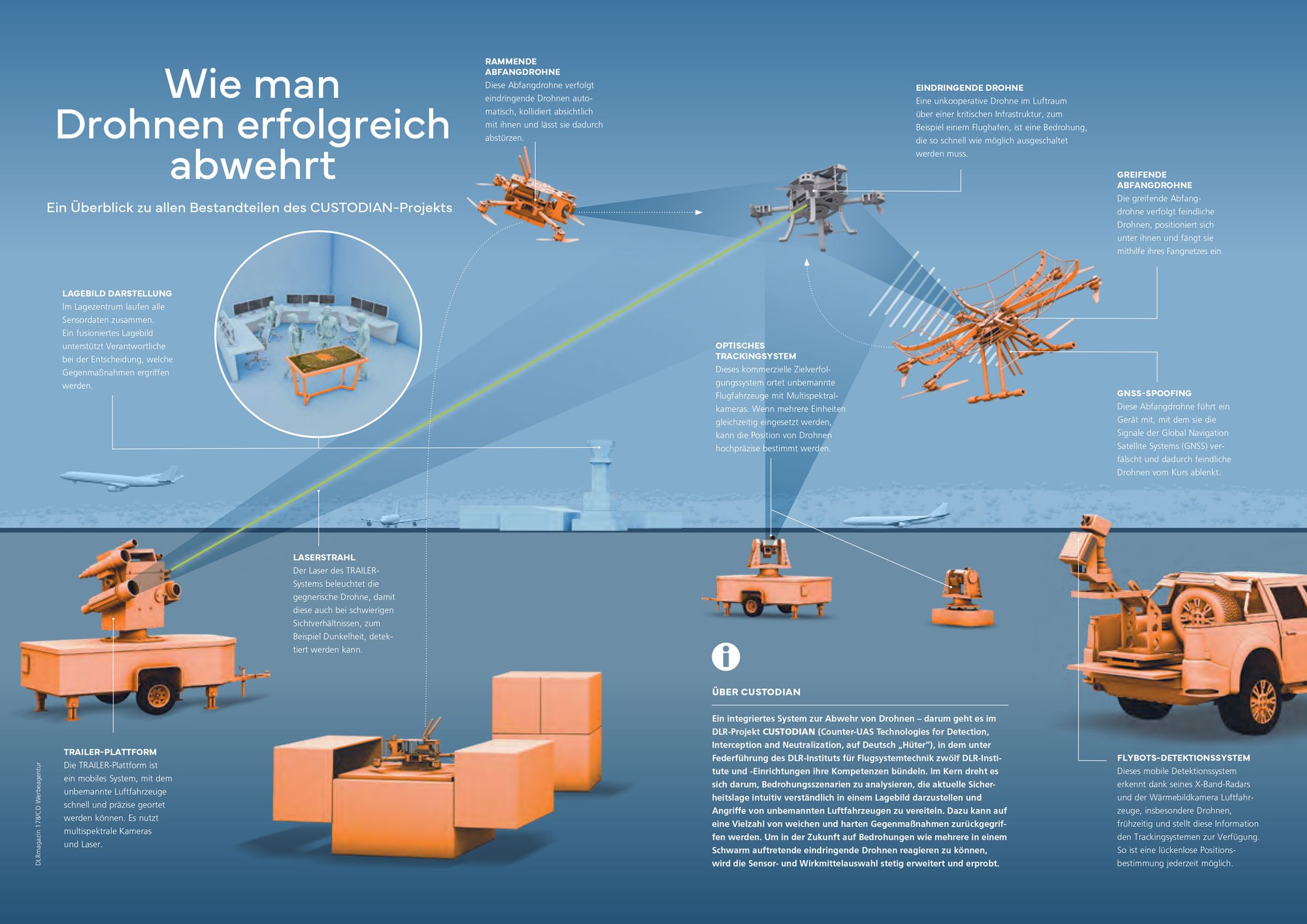 Im Projekt CUSTODIAN (Counter-UAS Technologies for Detection, Interception and Neutralization) bündeln zwölf DLR-Institute und Einrichtungen unter der Leitung des DLR-Instituts für Flugsystemtechnik ihre Kompetenzen zur Drohnenabwehr. Das DLR arbeitet an einer Vielzahl technischer Lösungen. Wissenschaftlerinnen und Wissenschaftler haben im Nationalen Erprobungszentrum für Unbemannte Luftfahrtsysteme des DLR in Cochstedt erfolgreich gezeigt, wie eine feindliche Drohne erkannt und unschädlich gemacht wird. Dabei haben die Forschenden unter anderem eine Drohne durch gezielte Beeinflussung des Navigationssignals zum Landen gezwungen. In einem anderen Szenario wurde eine feindliche Drohne von einer automatischen Abfangdrohne gerammt. Im DLR werden weitere Vorgehensweisen untersucht, um Drohnen unschädlich zu machen.