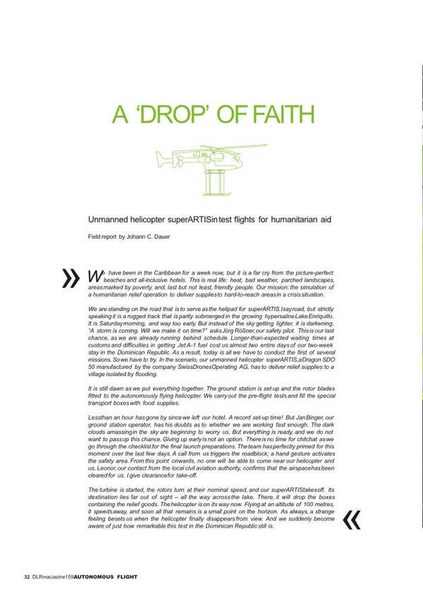 DLR has taken on the role of an architect for unmanned flight, forging a link between manufacturers, users and legislators with regard to technical and regulatory issues. Thanks to its numerous institutes, DLR is unique in Europe – having the necessary range of research areas and expertise to address unresolved issues in the headline areas of vehicle technology, flight guidance, legislation and acceptance research. Interdisciplinary research across DLR is also being pooled and tested at the National Experimental Test Center for Unmanned Aircraft Systems in Cochstedt which provides a unique test field. Not only is this test centre an important platform for networking and coordinating activities in UAS research, but it also facilitates the continued development of UAS technologies. Therefore, DLR is set to play a leading role in the development of scientific and economic progress in unmanned flight.