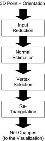 The goal of this reconstruction approach is to generate successively a single triangle mesh (which approximates the unknown, measured surface) by incrementally inserting the sensors data. In order to handle data of generic sensor types, the insertion is done point by point. This online approach can be described as a four step forward process chain.