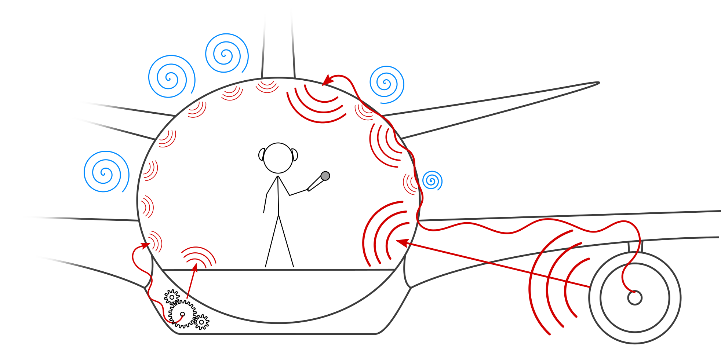 Geräuschquellen sind z.B. die Strömung in der turbulenten Grenzschicht welche auf den Rumpf einwirkt, ebenso die Triebwerke, welche Vibrationen in den Rumpf eintragen und Schall abstrahlen, der durch die Luft wieder bis an den Rumpf herangetragen wird. All diese Quellen wirken auf den Rumpf ein und werden von diesem auf die Kabine und die Kavität im Innern übertragen.