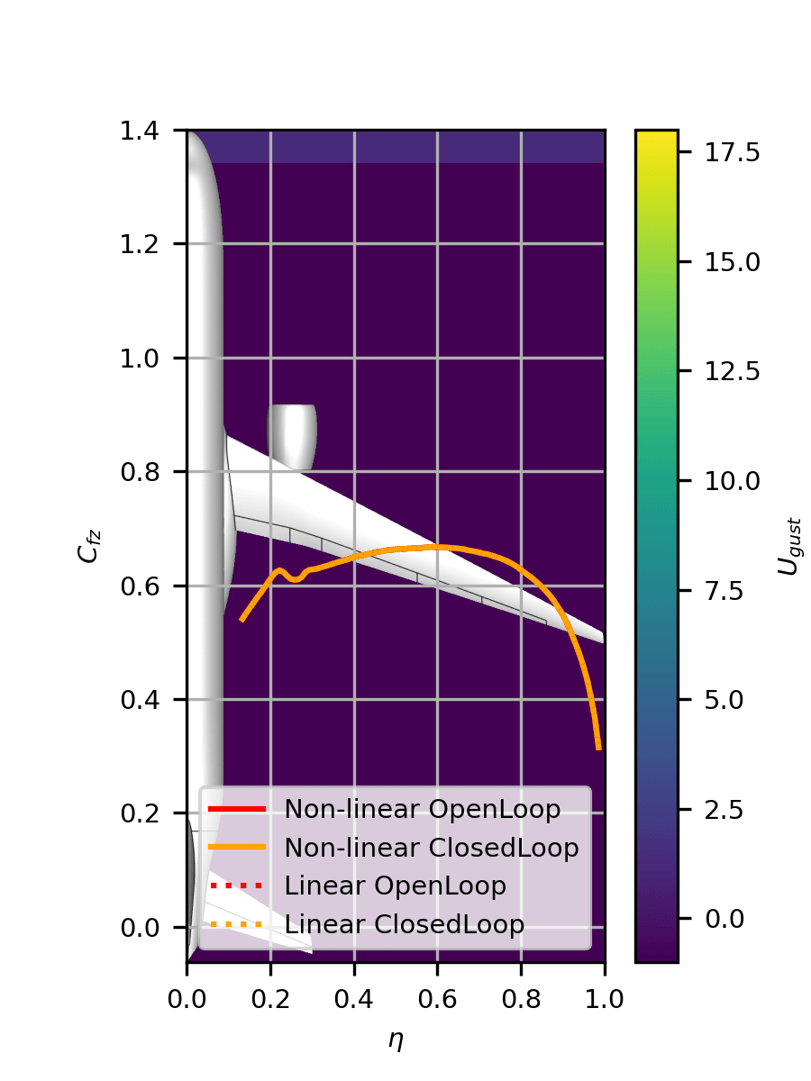 Abbildung 4 zeigt den Vergleich zwischen linearer und nichtlinearer Simulation, mit (closed Loop) und ohne Regler (open Loop). Diese Ergebnisse zeigen den lokalen Auftriebsbeiwert am Flügel während eines Böendurchfluges. Hier lässt sich ein deutlicher Unterschied zwischen den linearen und den nichtlinearen Ergebnissen sehen, welcher das Resultat der Strömungsablösung ist. Neben diesem nichtlinearen Effekt, ist auch die Auswirkung der vom Regler kommandierten Querruderausschläge vor allem für die linearen Simulationen zu beobachten.