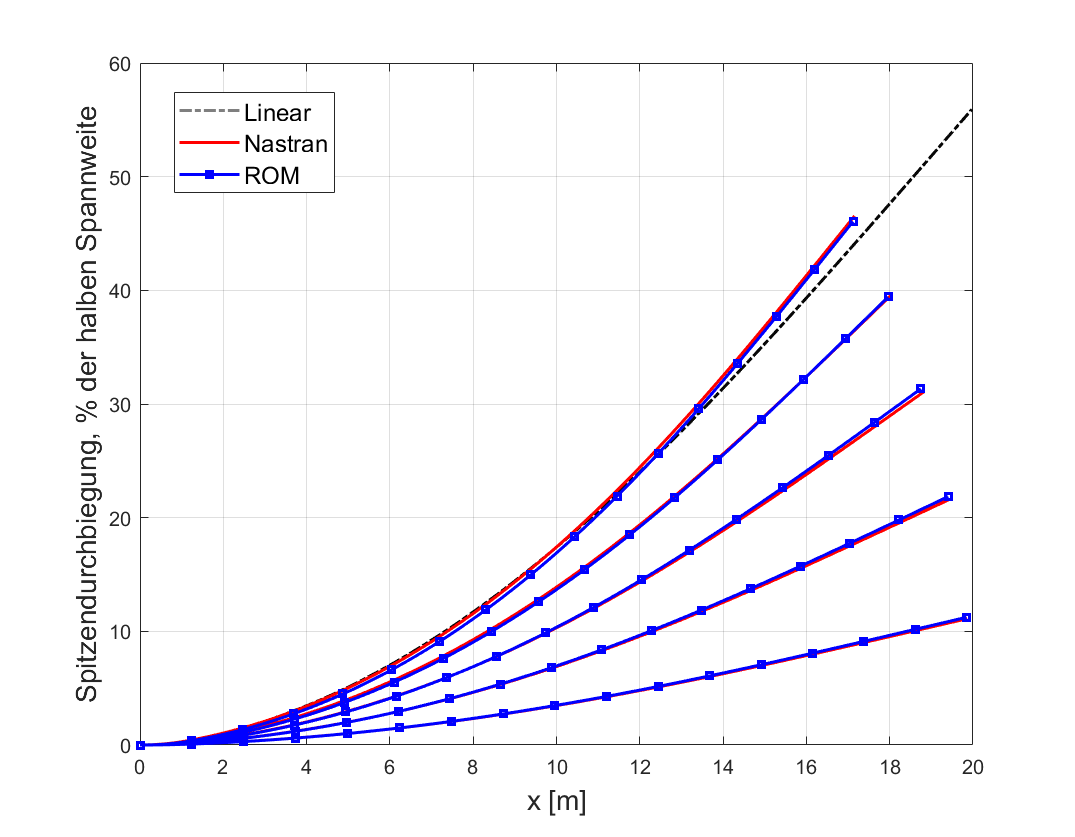 Durchbiegungsprofil entlang der Mittellinie in einem flexiblen Flügelkasten bei verschiedenen Belastungszuständen