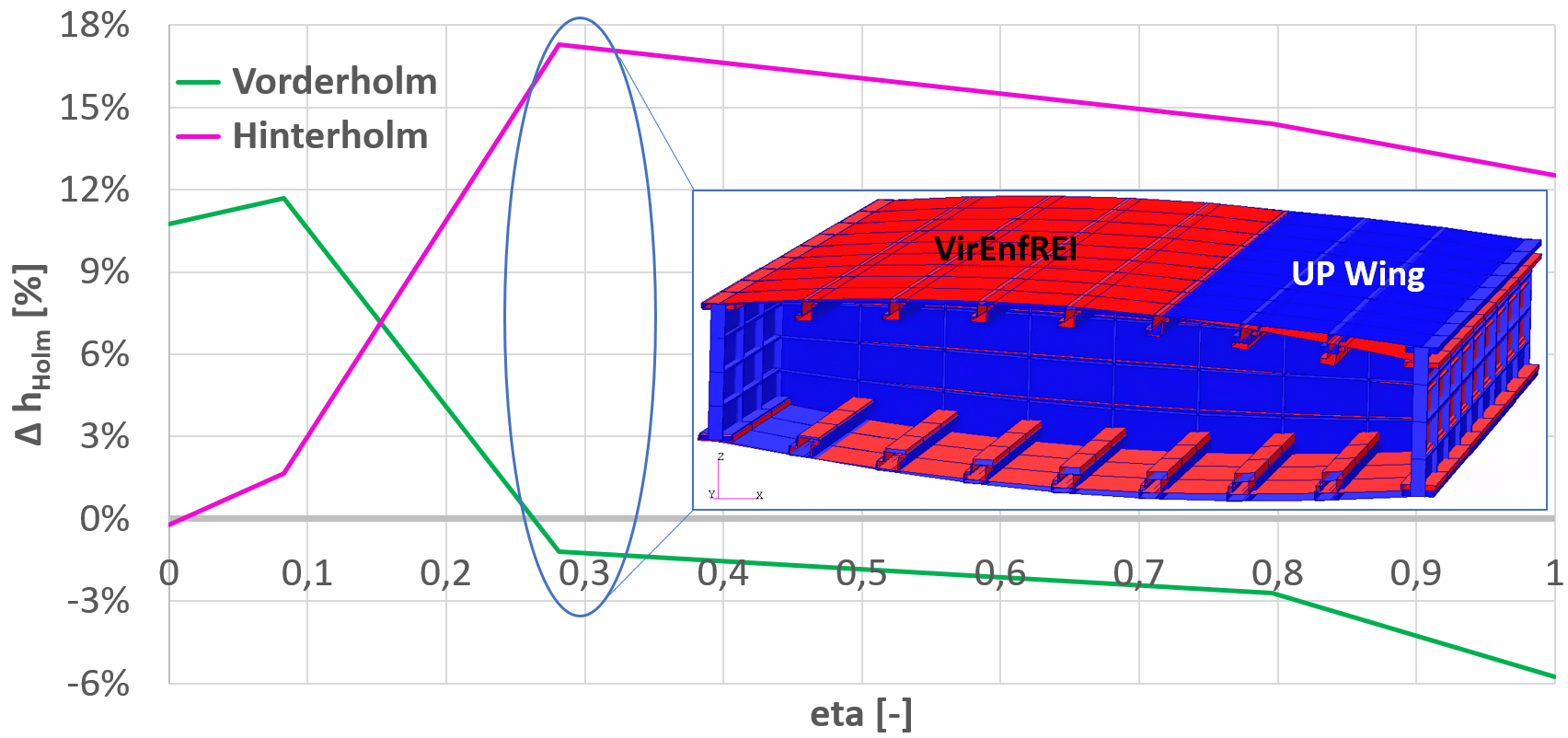 Relative Holmhöhen über der relativen Spannweite der UP Wing Konfiguration im Vergleich zum VirEnfREI Flügel