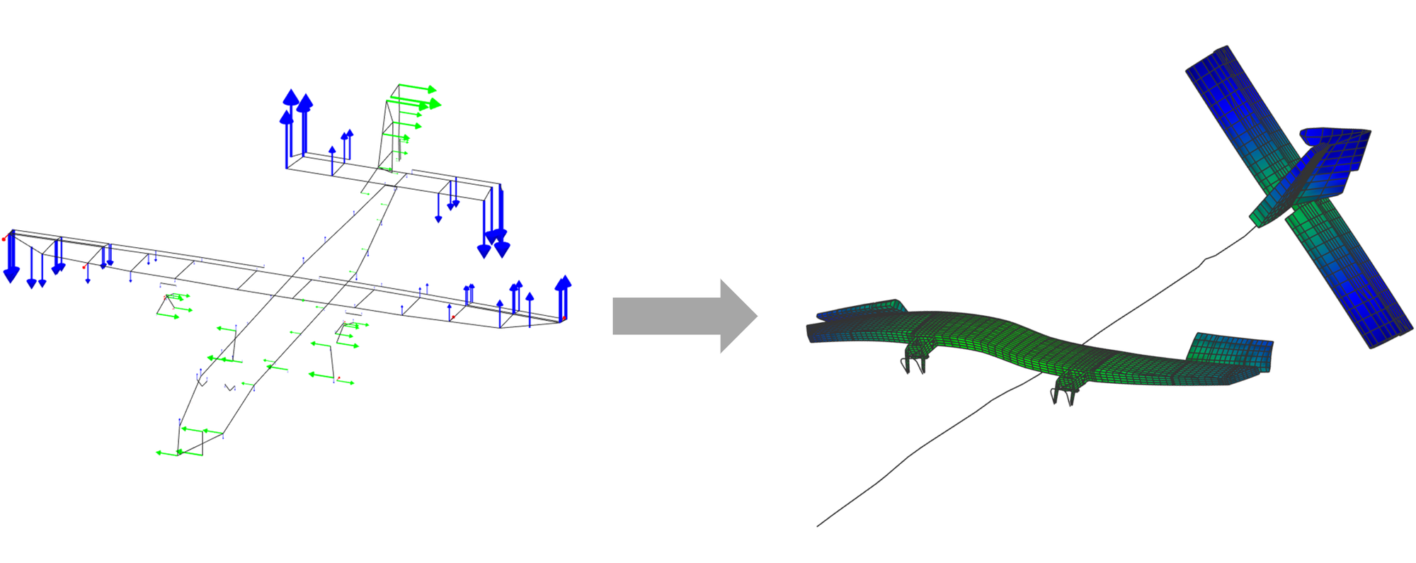 Do228 Electric Flight Demonstrator - Darstellung einer am Flugzeug gemessenen Schwingungsform (links) und Darstellung der simulierten Schwingungsform im Simulationsmodell des Flugzeugs (rechts)