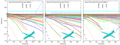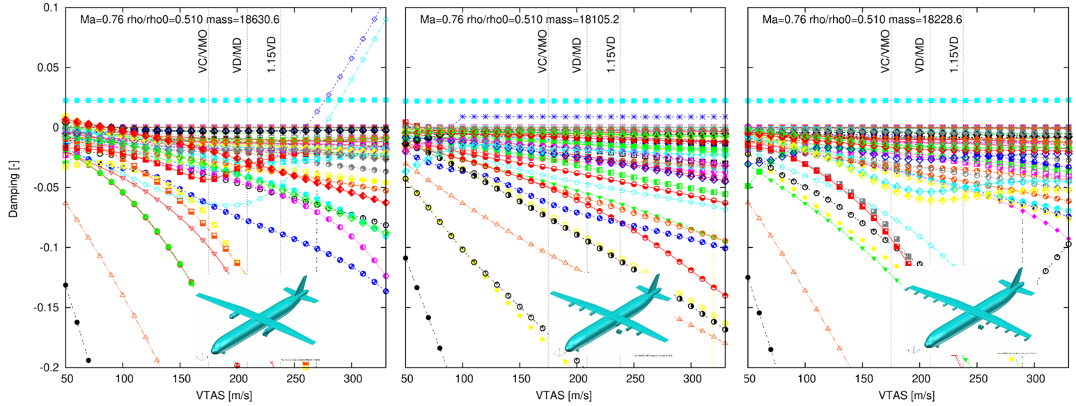 Flatterkurven (Dämpfung über die Fluggeschwindigkeit) für die Konfigurationen mit 2-, 6- und 12 elektrischen Antriebseinheiten