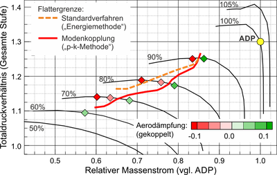 Aktuelle Triebwerksschaufeln werden nach dem oben beschriebenen Verfahren bewertet, welches Kopplungseffekte nicht berücksichtigt und dass sich seit Jahrzehnten bewährt hat. Der flatterfreie Betriebsbereich kann während der Entwurfsphase mit guter Sicherheit vorhergesagt werden. Das Massenverhältnis dieser Entwürfe liegt immer noch über einem Schwellenwert, bei dem Flattern durch Modenkopplung berücksichtigt werden muss.