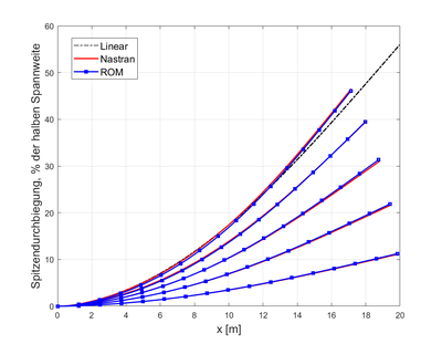 Durchbiegungsprofil entlang der Mittellinie in einem flexiblen Flügelkasten bei verschiedenen Belastungszuständen