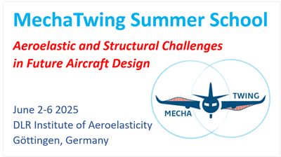 we kindly invite you to our first Summer School from June 2 to June 6 as part of the project MechaTwing, funded by the European Union. We will bring together scientists and experts for lectures, workshops, and technical discussions with a focus on the aeroelastic and structural challenges in future aircraft design.Future transport aircraft are characterized by the urgent need to lower climate-damaging emissions. From the aircraft design point of view, new concepts, such as high aspect ratio wings, show great promise. They lower the induced drag significantly but implicate a number of aeroelastic challenges. The demanding aerodynamic design for transonic airspeeds and the high structural flexibility of high aspect ratio configurations require new methods for the multidisciplinary (aeroelastic) analyses and optimization. Nonlinearities are present in all the disciplines involved, and advanced control methods are required to ensure feasibility and safe operation (e.g. loads and flutter control). Also novel actuation technologies based on mechatronic systems which can drive control surfaces in limited space with high bandwidth are required. Various topics related to these challenges are treated in this summer school in terms of lectures and workshops, including experiments and the introduction of specific software: