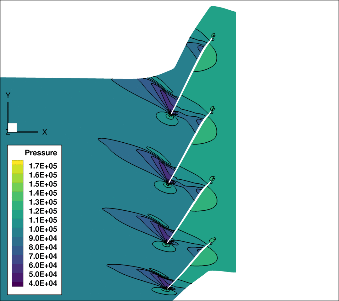 Nichtlineare aerodynamische Effekte und Einfluss der Variation der Schaufelschwingungen auf das instationäre Druckverteilungsfeld eines Verdichtergitters (Amplitude: 1,2% Sehnenlänge der Blattspitze (10x))