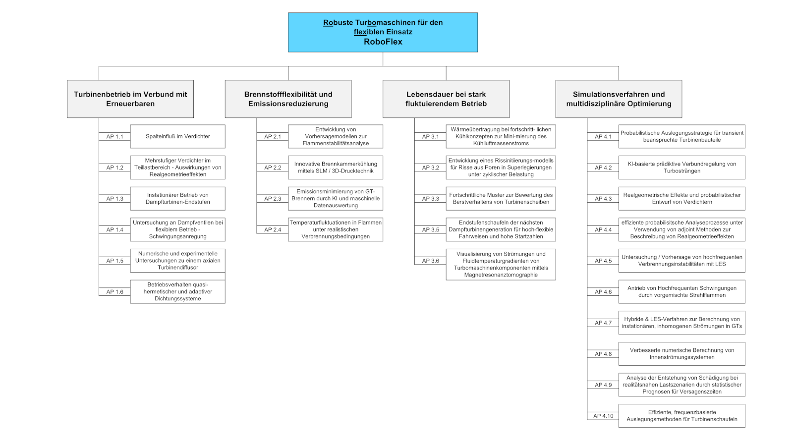 Im AP 1 „Turbinenbetrieb im Verbund mit Erneuerbaren“ und im AP 2 „Brennstoffflexibilität und Emissionsreduzierung“ liegt der Schwerpunkt der Projekte in der Auswirkung der Flexibilität sowohl auf den Betrieb als auch im Bezug der eingesetzten Brennstoffe auf die Auslegung von Gasturbinen.