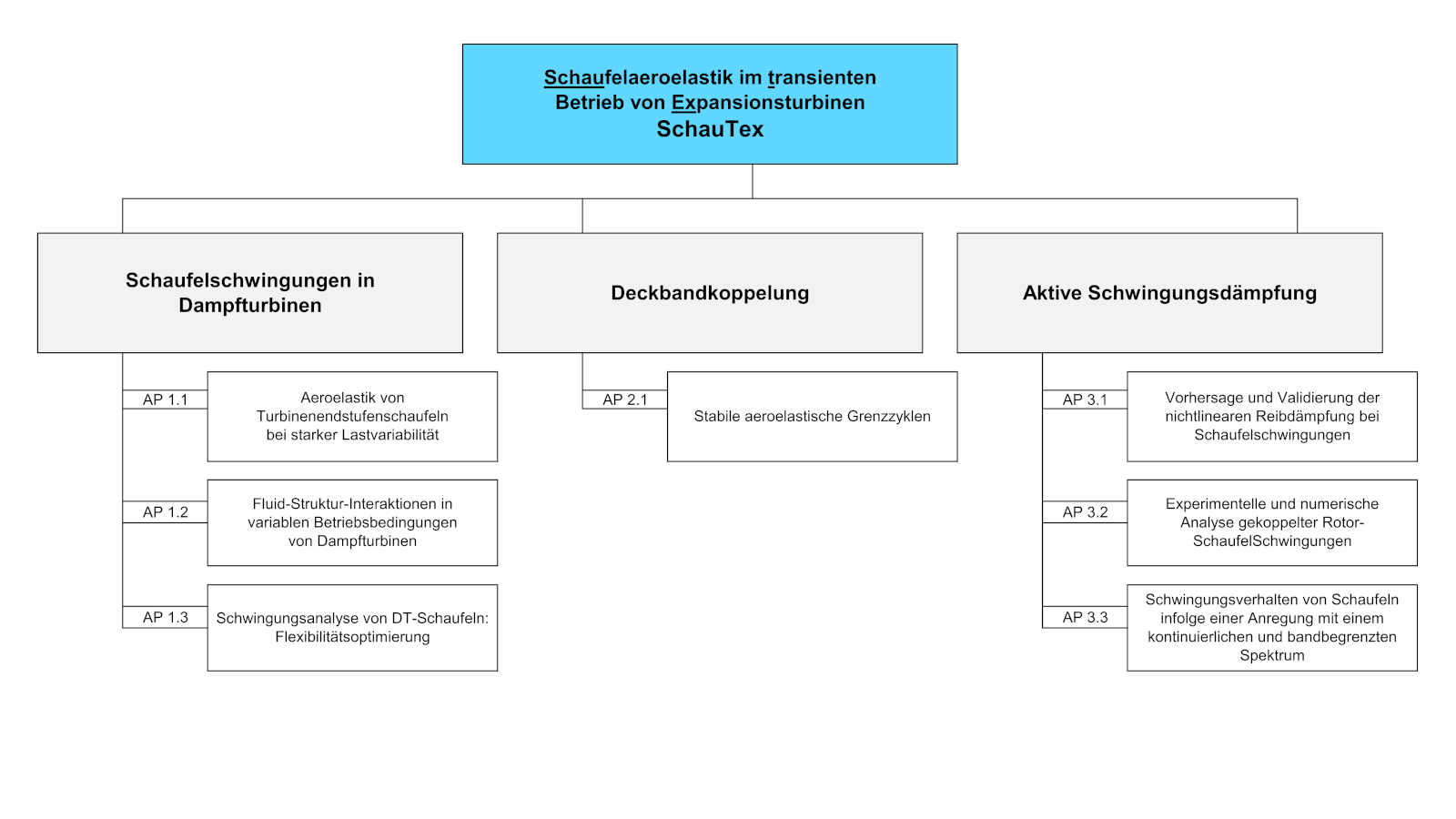 Im Arbeitspaket 1 sind Arbeiten zusammengefasst, die sich mit Fragen der Aeroelastik von Turbinenendstufenschaufeln beschäftigen, die aufgrund Ihrer großen Abmessungen besonders schwingungsanfällig sind. In Teillast betriebene Turbinen neigen zu einer besonderen Lastverlagerung hin zu den Schaufelspitzen der Rotoren mit lokal hohen Machzahlen und damit verbunden starker Strömungsablösung. Dementsprechend sind die Anregungsmechanismen sehr ausgeprägt, und bei der Auslegung dieser Schaufeln müssen die Strömungsphänomene verstanden und beherrscht werden.