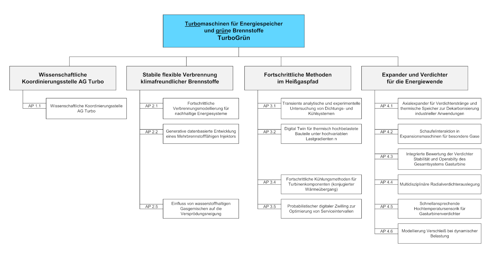 Das Verbundvorhaben gliedert sich in thematisch übergeordnete Arbeitspakete, in denen die Entwicklung von Turbokomponenten für unterschiedliche Anwendungsbereiche im neuen Energiemix vorangetrieben werden. Die Arbeiten des Verbundvorhabens TurboGrün tragen zur Erfüllung der Ziele der 7. Energieforschungsprogramm „Innovationen für die Energiewende“ bei.