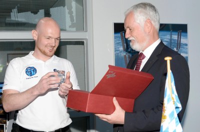 In Erinnerung an die Zusammenarbeit vor und während seines sechsmonatigen Aufenthalts im All überreichten das DLR und das GSOC dem "Rückkehrer" zum Abschied noch mehrere Geschenke: darunter eine kleine gefräste Astronautenfigur sowie ein Album mit Fotos und Videos zu Alexander Gerst und seiner Mission "Blue Dot".