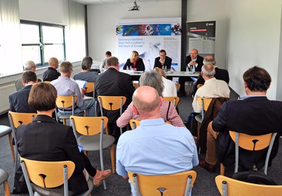 Unter diesem Motto trafen sich am Dienstag, den 12.Mai 2015, die saarländische Ministerin für Wirtschaft, Arbeit, Energie und Verkehr, Frau Anke Rehlinger, SPD, und der DLR- Vorstandsvorsitzende, Prof. Dr.-Ing. Johann-Dietrich Wörner, am Flughafen Saarbrücken zu einem Informationsgespräch mit Vertretern saarländischer Unternehmen und wissenschaftlicher Einrichtungen.
