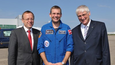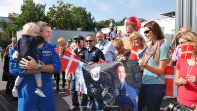 Die Anreise für diesen "Gesundheitscheck" ist lang: Von der ISS aus ging es zunächst einmal – gemeinsam mit den Kosmonauten Gennadij Padalka und Aidyn Aimbetow - am 11. September 2015 um 23.29 Uhr (MESZ) mit der Sojuz-Kapsel in Richtung Erde. Von der Landestelle in der kasachischen Steppe ging es dann per Hubschrauber zum Flugzeug, das den 40-jährigen Dänen über Moskau nach Köln bringt. Empfangen wird er dort unter unterem von DLR-Raumfahrtvorstand Prof. Hansjörg Dittus und ESA-Generaldirektor Prof. Jan Wörner.