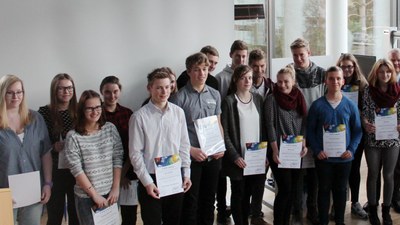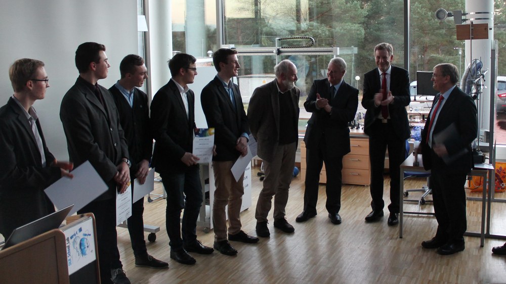Im Rahmen einer feierlichen Veranstaltung am DLR-Standort Neustrelitz wurden die Preisträger am 27. November 2015 von der GvF ausgezeichnet und erhielten den mit 2.500 Euro dotierten Preis. Dabei würdigten Peter Georgino, Leiter des DLR-Standortes Neustrelitz, und der Vorsitzenden der GvF Horst Rauck in ihren Grußworten die Arbeit der Nachwuchsforscher. Darüber hinaus erhielten die Preisträger einen Einblick in die wissenschaftliche Arbeit des DLR-Instituts für Methodik der Fernerkundung zum Thema Licht. Bei der anschließenden Führung durch den Standort konnten die Schülerinnen und Schüler weitere Forschungsbereiche kennenlernen und mit den Wissenschaftlerinnen und Wissenschaftlern ins Gespräch kommen.