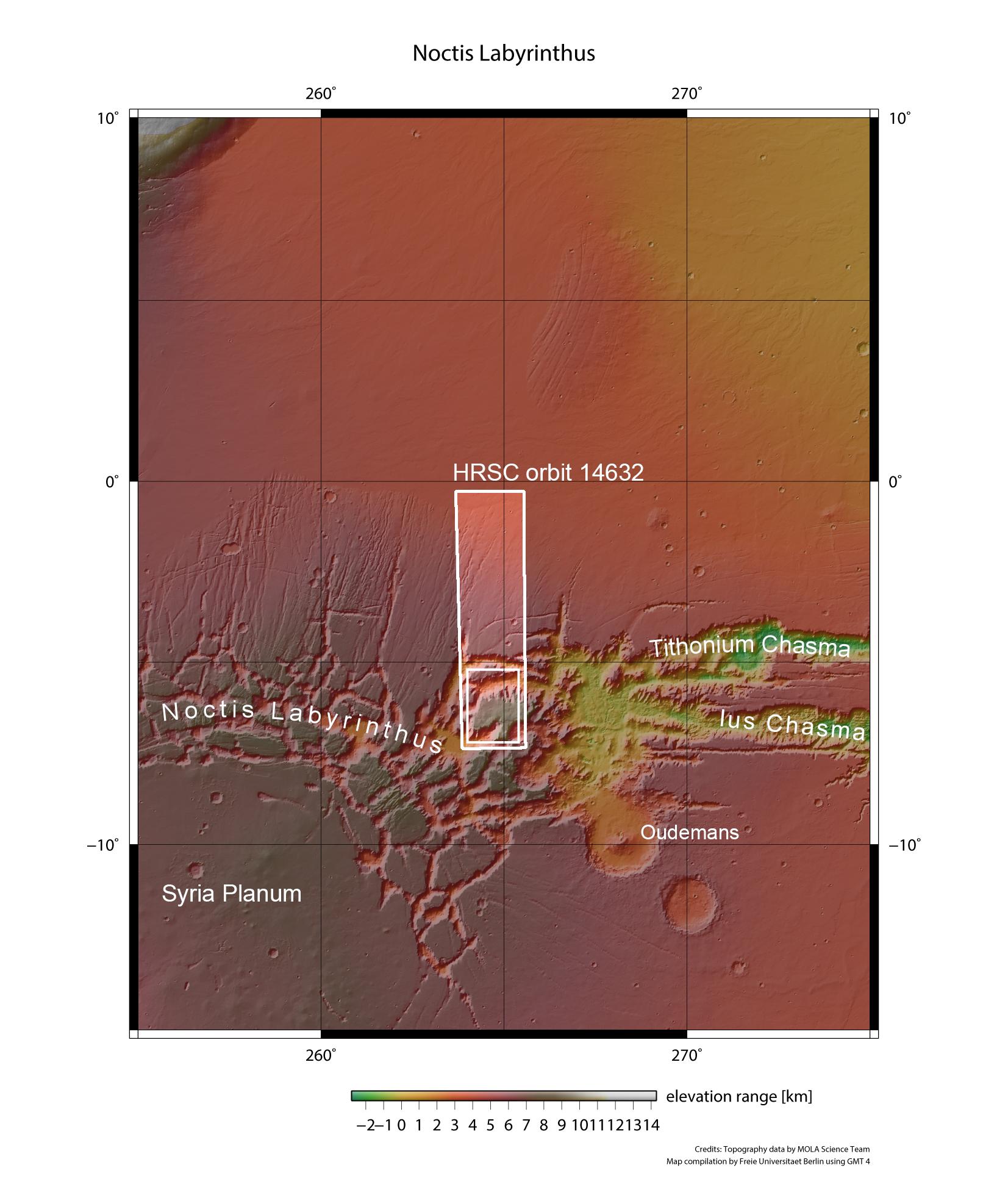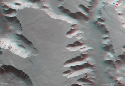 Direkt westlich des gigantischen Grabensystems der Valles Marineris auf dem Mars schließt sich ein nicht minder beeindruckendes Gebiet an: das sogenannte Noctis Labyrinthus - das Labyrinth der Nacht. Es besteht aus einem Wirrwarr sich kreuzender Täler und bis zu sechs Kilometer tiefen Schluchten. Mit einer Ost-West-Ausdehnung von über 1200 Kilometern entspricht es in etwa der Länge des Rheins und könnte auf der Erde weit mehr als das Gebiet Deutschlands von den Alpen bis hin zur Nordsee bedecken. Die hier gezeigten Aufnahmen wurden im Juli 2015 von der vom Deutschen Zentrum für Luft- und Raumfahrt (DLR) betriebenen, hochauflösenden Stereokamera HRSC aufgenommen und zeigen einen Teil am nordöstlichen Rand des Labyrinths.