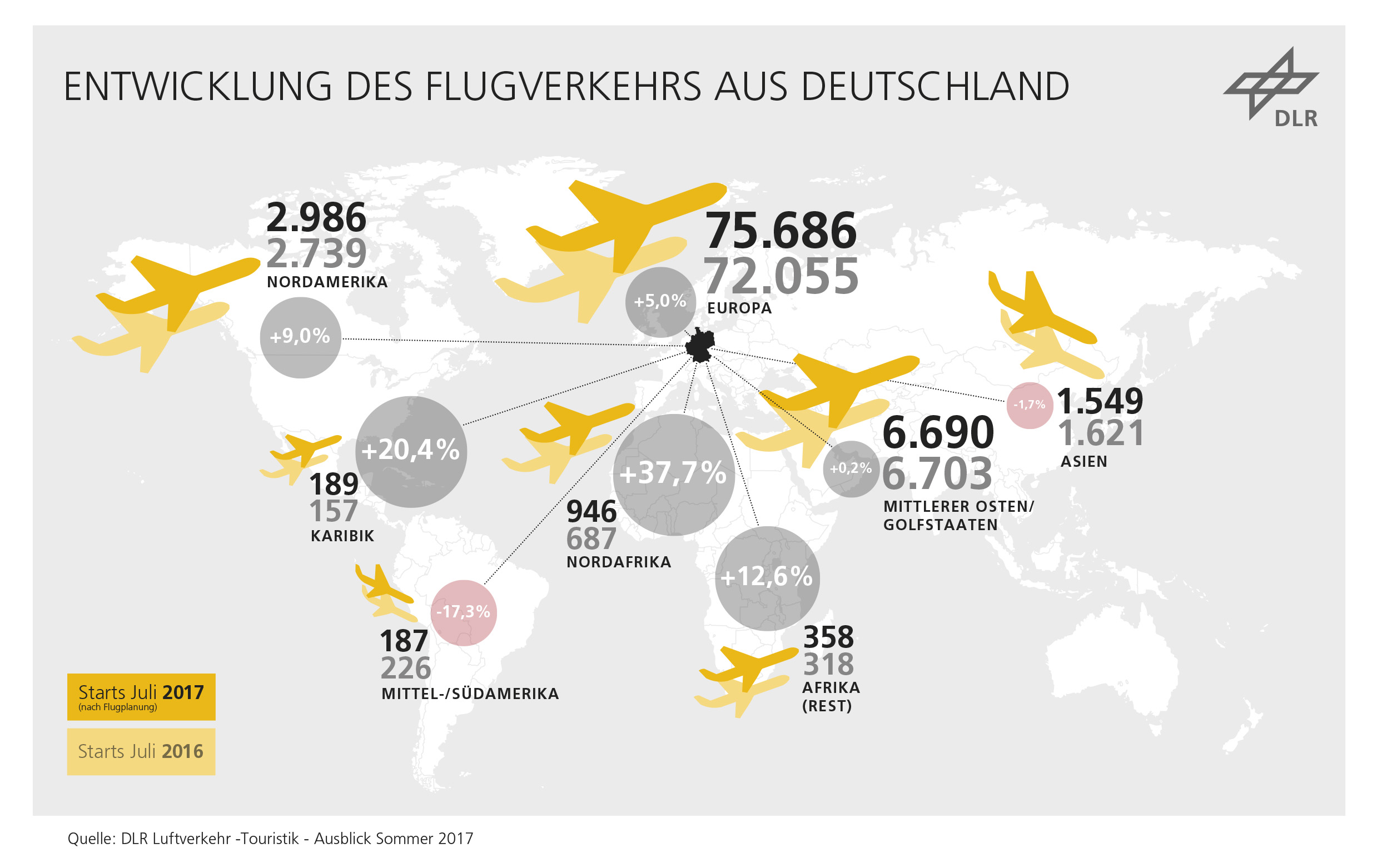 "Ein starker Aufwind treibt den Ferienflieger-Markt in die Höhe", sagt Dr. Peter Berster vom DLR-Institut für Flughafenwesen und Luftverkehr (heute Institut für Luftverkehr). "Rund 30 Prozent Wachstum verzeichnen die Anbieter derzeit bei Flügen in die Schwarzmeerziele, nach Nordafrika und in die Karibik. Auch die mediterranen Warmwassergebiete liegen meist über dem Durchschnitt, während die Zahl aller Flüge im deutschen Luftverkehr nur um rund knapp fünf Prozent steigt." Die aufkommensstärksten Zielländer sind dabei Spanien und Italien mit mittlerweile zusammen knapp 16.000 geplanten Starts im Juli 2017. Dabei verzeichnen Griechenland, Portugal sowie die Schwarzmeerziele Rumänien und Bulgarien zweistellige Zuwachsraten.