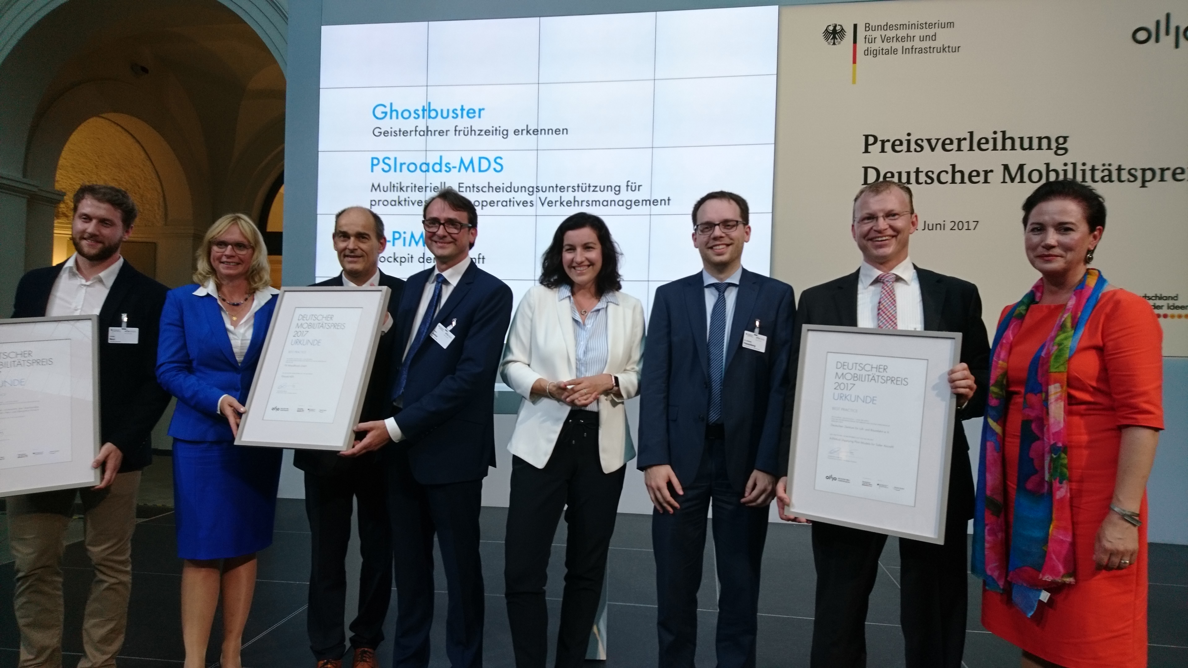 Das Projekt wurde nun von der Initiative "Deutschland - Land der Ideen" und dem Bundesministerium für Verkehr und digitale Infrastruktur als eines von zehn herausragenden digitalen Innovationen für eine sichere Mobilität ausgezeichnet. Die Abgeordnete Dorothee Bär, Parlamentarische Staatssekretärin beim Bundesminister für Verkehr und digitale Infrastruktur (BMVI), und Ute Weiland, Geschäftsführerin der Initiative "Deutschland - Land der Ideen", überreichten die Preise, für die 170 Bewerbungen eingingen, im Bundesverkehrsministerium in Berlin.