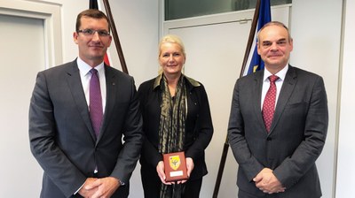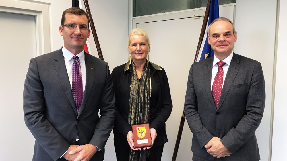 Am 7. September 2018 trafen sich Benedikt Zimmer, Staatssekretär für Rüstungsangelegenheiten des Bundesministeriums der Verteidigung (BMVg), Prof. Dr. Pascale Ehrenfreund, Vorstandsvorsitzende des DLR, und Dr. Dennis Göge, Programmkoordinator für Sicherheitsforschung, im Rahmen eines strategischen Dialoges in Bonn und besprachen Aspekte der zukünftigen Zusammenarbeit.