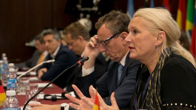 Prof. Pascale Ehrenfreund präsentierte das DLR als Forschungsorganisation, das in vielen Forschungsprojekten zusammen mit lokalen Partnern an der Entwicklung von Lösungen für Lateinamerika und die Karibik beteiligt ist. Zudem präsentierte Ehrenfreund das wissenschaftliche Portfolio der DLR-Forschungsaktivitäten, die gemeinsam mit Partnern aus Lateinamerika und der Karibik durchgeführt werden. Im Jahr 2018 begeht das DLR das einjährige Bestehen des Projekts RIESGOS (Multi-Risiko-Analyse- und Informationssystemkomponenten für die Andenregion), das auf die Entwicklung einer innovativen Forschung zur Risikoanalyse der verschiedenen Naturgefahren für die Andenregion abzielt und der damit verbundenen Kaskadeneffekte. Das deutsche Konsortium arbeitet dabei mit 25 südamerikanischen Partnern aus Chile, Ecuador und Peru zusammen, um innovative Forschungsmethoden und -ideen bereitzustellen und in vorhandene Komponenten zu integrieren. Das Projekt entwickelt "Was-wäre-wenn-Szenarien" und trägt so zur proaktiven Vorbereitung auf Katastrophenereignisse bei.