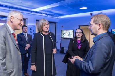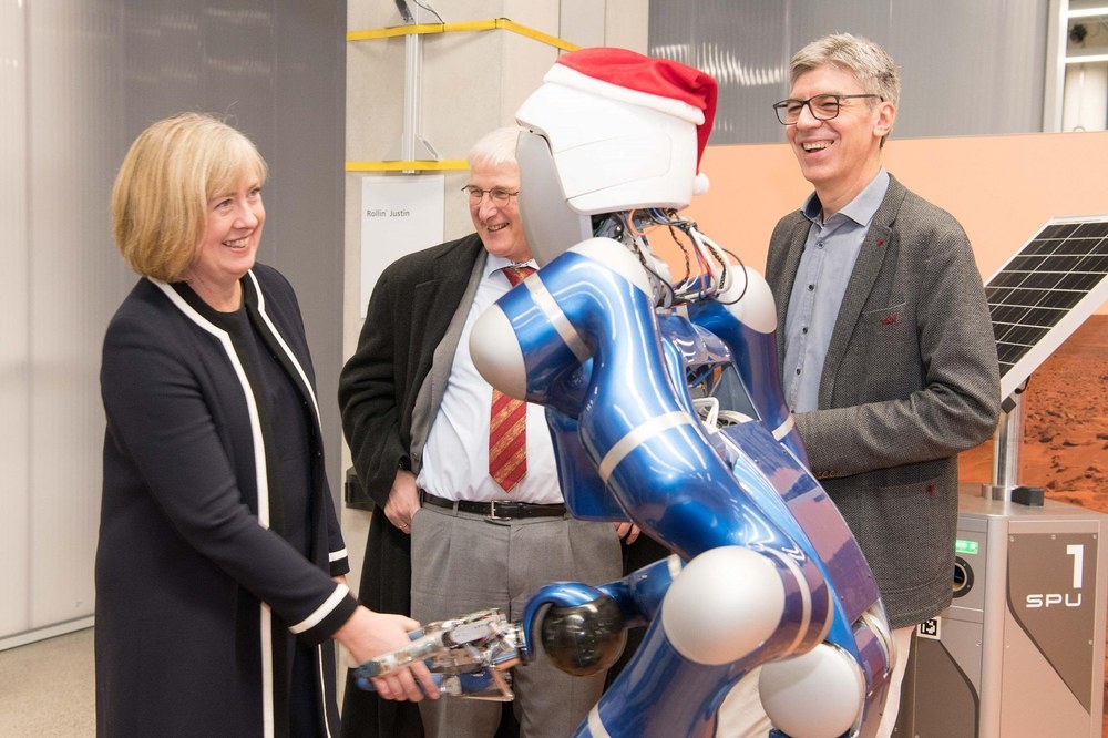 Zum Abschluss des Besuches schüttelte Lynette Wood beim Institut für Robotik und Mechatronik die Hand des humanioden Roboters Justin und erlebte Robotik und Medizintechnik auf höchstem Niveau. Vorgestellt wurde das Medizinprojekt SMiLE: Im Projekt SMiLE werden Konzepte und Assistenz-Anwendungen entwickelt, um sowohl Menschen mit Behinderungen als auch pflegebedürftigen Personen eine effektive Unterstützung im Alltag zu bieten.