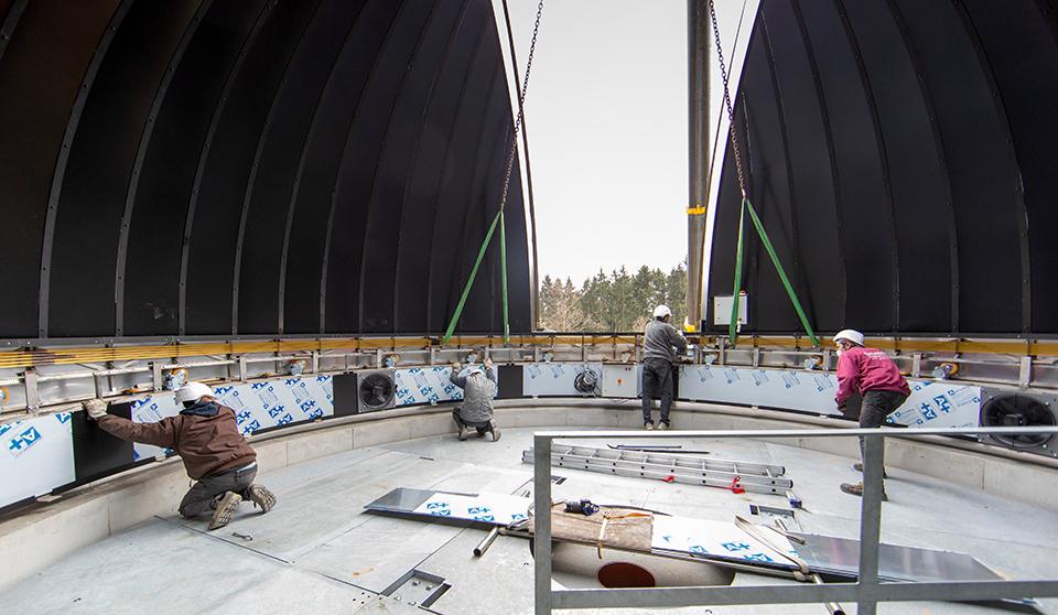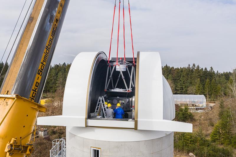 - Kuppel und Teleskop sind mit einem Spezialkran auf den Rohbau gehoben und montiert worden.