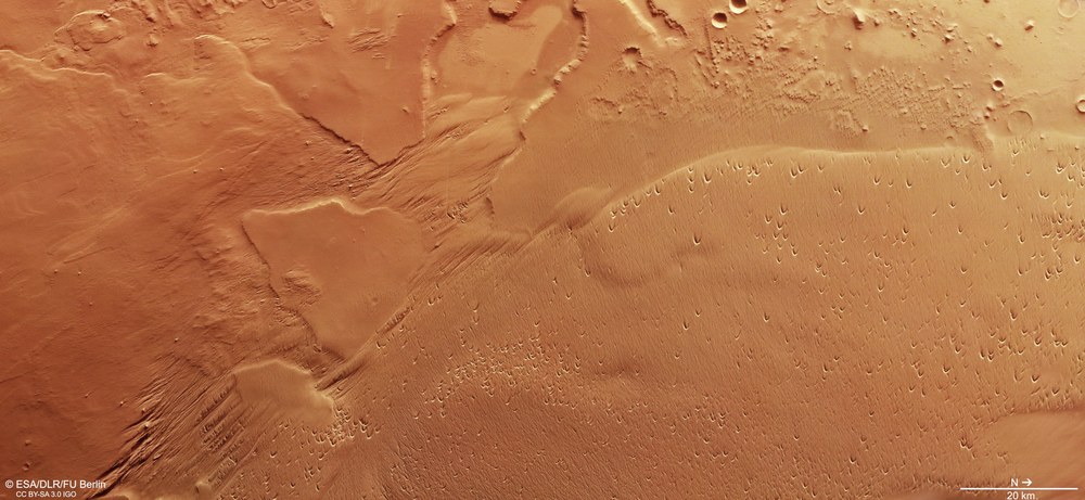 - Bilder der DLR-Marskamera zeigen eine Landschaft um die Bergkette Eumenides Dorsum in der Region Medusae Fossae, die stark vom Wind geprägt ist. Der Wind ist seit zwei Milliarden Jahren die bedeutendste Kraft bei der Umgestaltung der Oberfläche des Roten Planeten.
