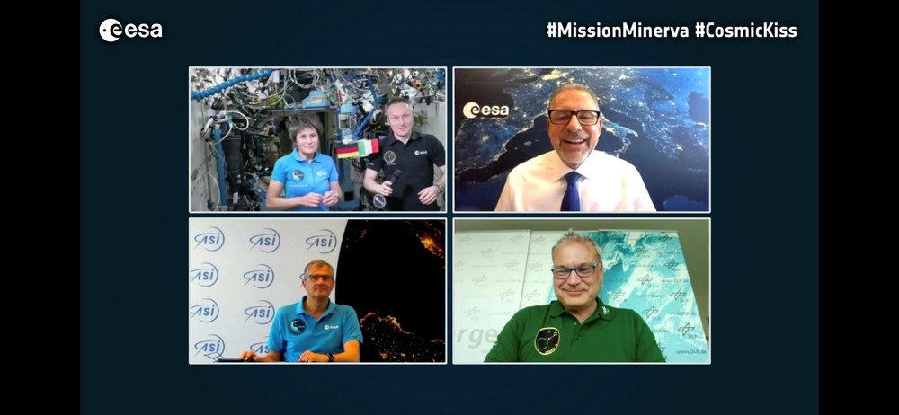 Erstmals seit 2011 sind zwei ESA-Astronauten ein paar Tage zeitgleich auf der Internationalen Raumstation ISS: Der Deutsche Matthias Maurer, dessen erste ISS-Mission Cosmic Kiss in den nächsten Tagen zu Ende geht, und die Italienerin Samantha Cristoforetti, die seit dem 28. April 2022 mit "Minerva" zum zweiten Mal auf der Raumstation lebt und arbeitet. Am 2. Mai um 15:15 Uhr Mitteleuropäischer Sommerzeit nutzten die Beiden diese seltene Gelegenheit für ein gemeinsames Video-Telefonat mit ESA-Generaldirektor Josef Aschbacher sowie DLR-Vorstandsmitglied Dr. Walther Pelzer, der in seiner Funktion als Leiter der Deutschen Raumfahrtagentur im Auftrag der Bundesregierung auch die deutschen ESA-Programme managt, und Giorgio Saccoccia, dem Präsidenten der italienischen Raumfahrtagentur ASI.