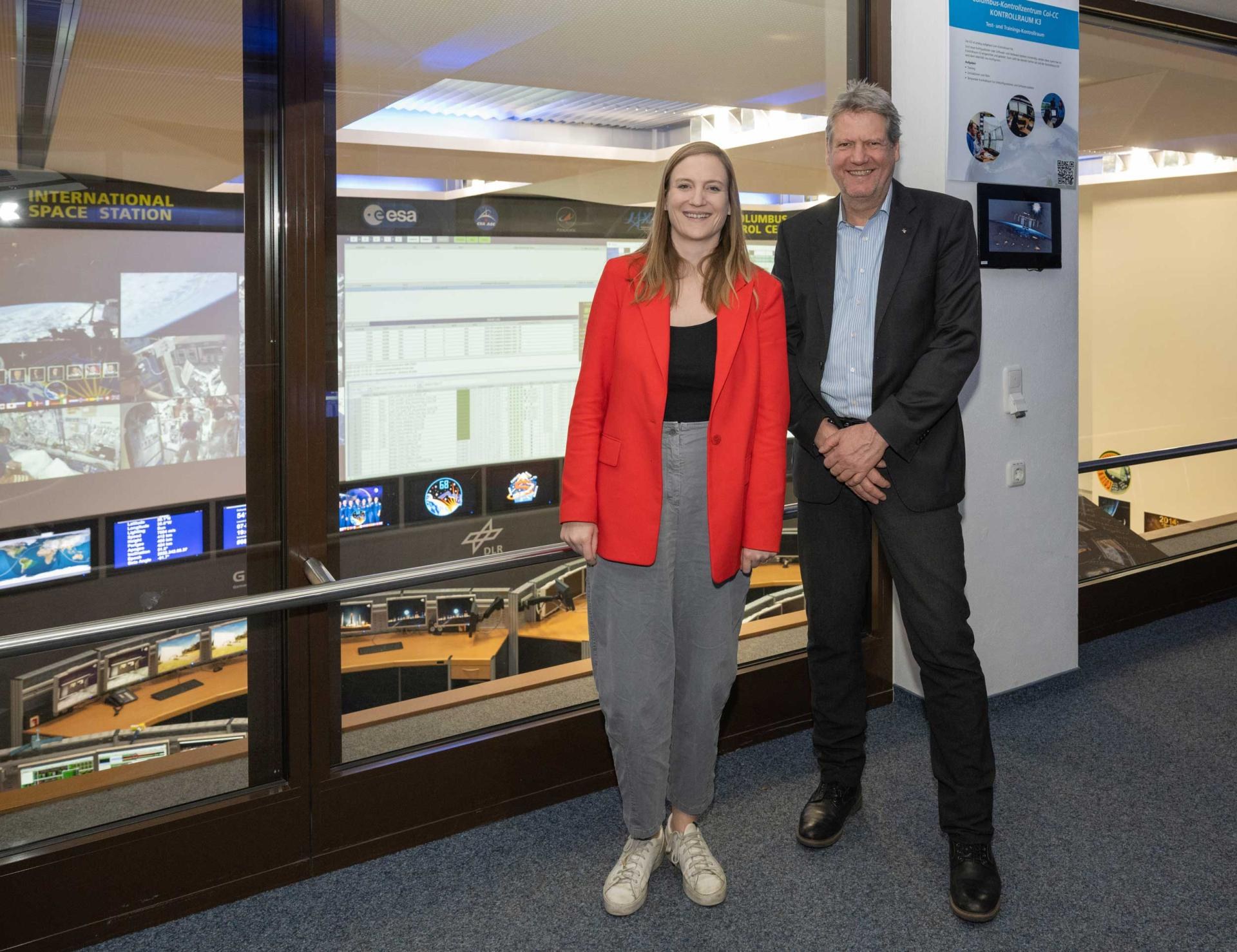 Im Nationalen Raumfahrtkontrollzentrum GSOC erhielt Bundestagsabgeordnete Carmen Wegge Einblick in den Betrieb von Raumfahrtmissionen. Von Oberpfaffenhofen aus wird unter anderem der deutsche Erdbeobachtungssatellit EnMAP betrieben sowie das Columbus-Modul der Internationalen Raumstation ISS. Künftig will das GSOC auch austronautische Missionen zum Mond und Mars unterstützen. Das Bild vor dem Columbus-Kontrollraum zeigt Carmen Wegge mit Dr. Florian Sellmaier.