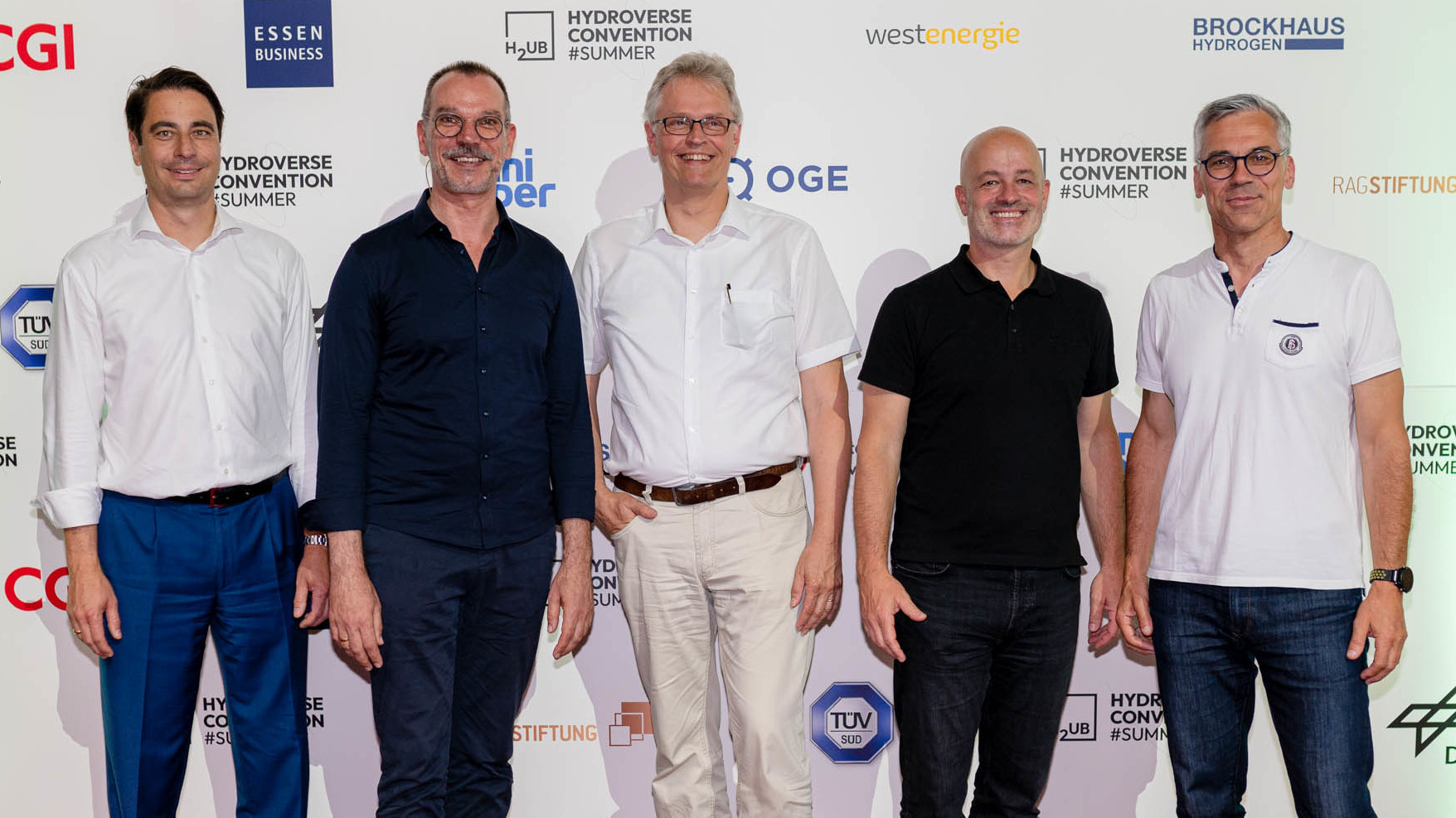 Von links: Tobias Frick, RAG-Stiftung, Dr. Uwe Kerkmann, CEO H2UB, Prof. Karsten Lemmer, DLR-Vorstandsmitglied und verantwortlich für den Bereich Innovation, Transfer und wissenschaftliche Infrastrukturen, Ralf Werner, OGE, und Jörg Oldorf, TÜV Süd