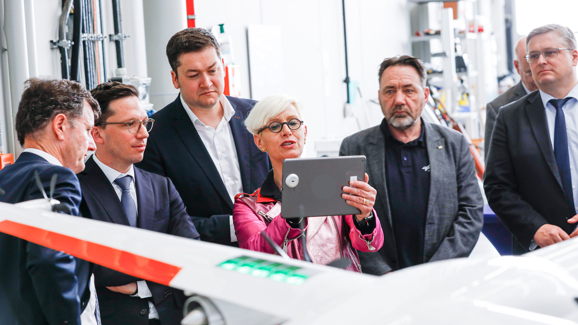 Die DLR-Vorstandsvorsitzende Prof. Dr.-Ing. Anke Kaysser-Pyzalla erklärt den Gästen das eFlight-Modell.