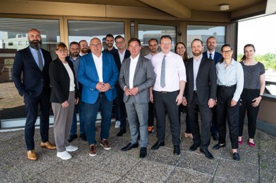 Die Bundestagsabgeordneten Sebastian Hartmann (4. v. l.) und Ingo Schäfer (3. v. l.) informierten sich bei einem Besuch des DLR in Sankt Augustin über die Forschung zum Schutz kritischer Infrastrukturen.