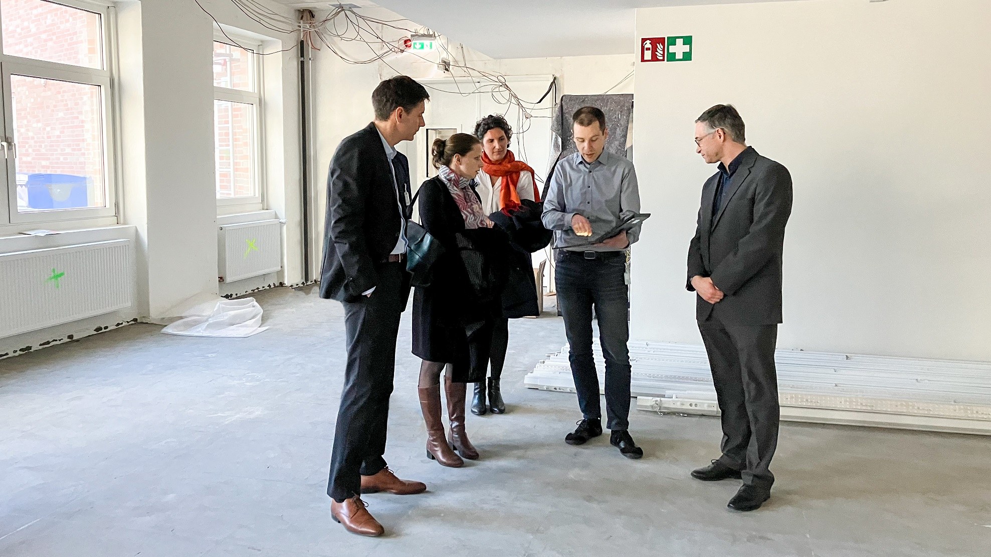 Dr. Robert Axmann, Leiter der DLR Quantencomputing-Initiative (DLR QCI), führt Senatorin Leonhard durch die zukünftigen Räumlichkeiten