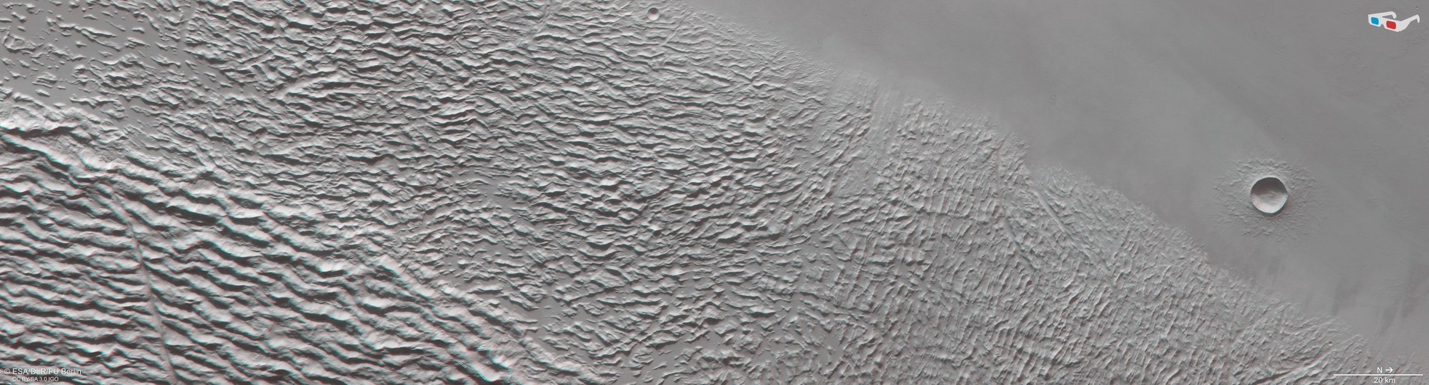 Aus dem senkrecht auf die Marsoberfläche gerichteten Nadirkanal des vom DLR betriebenen Kamerasystems HRSC auf der ESA-Sonde Mars Express und einem der vier schräg blickenden Stereokanälen lassen sich sogenannte Anaglyphenbilder erzeugen. Sie ermöglichen bei der Verwendung einer Rot-Blau- oder Rot-Grün-Brille eine dreidimensionale Ansicht der Landschaft und geben dem Betrachter eine räumliche Vorstellung der Höhenunterschiede. Bei solcher Betrachtung sticht zum einen der Übergang der Tiefebene Amazonis Planitia im Norden (rechts im Bild) und den beiden Bergsturz-Ablagerungen der Lycus Sulci im Nordwesten des Vulkans Olympus Mons (Bildmitte bzw. linke Bildhälfte) ins Auge.