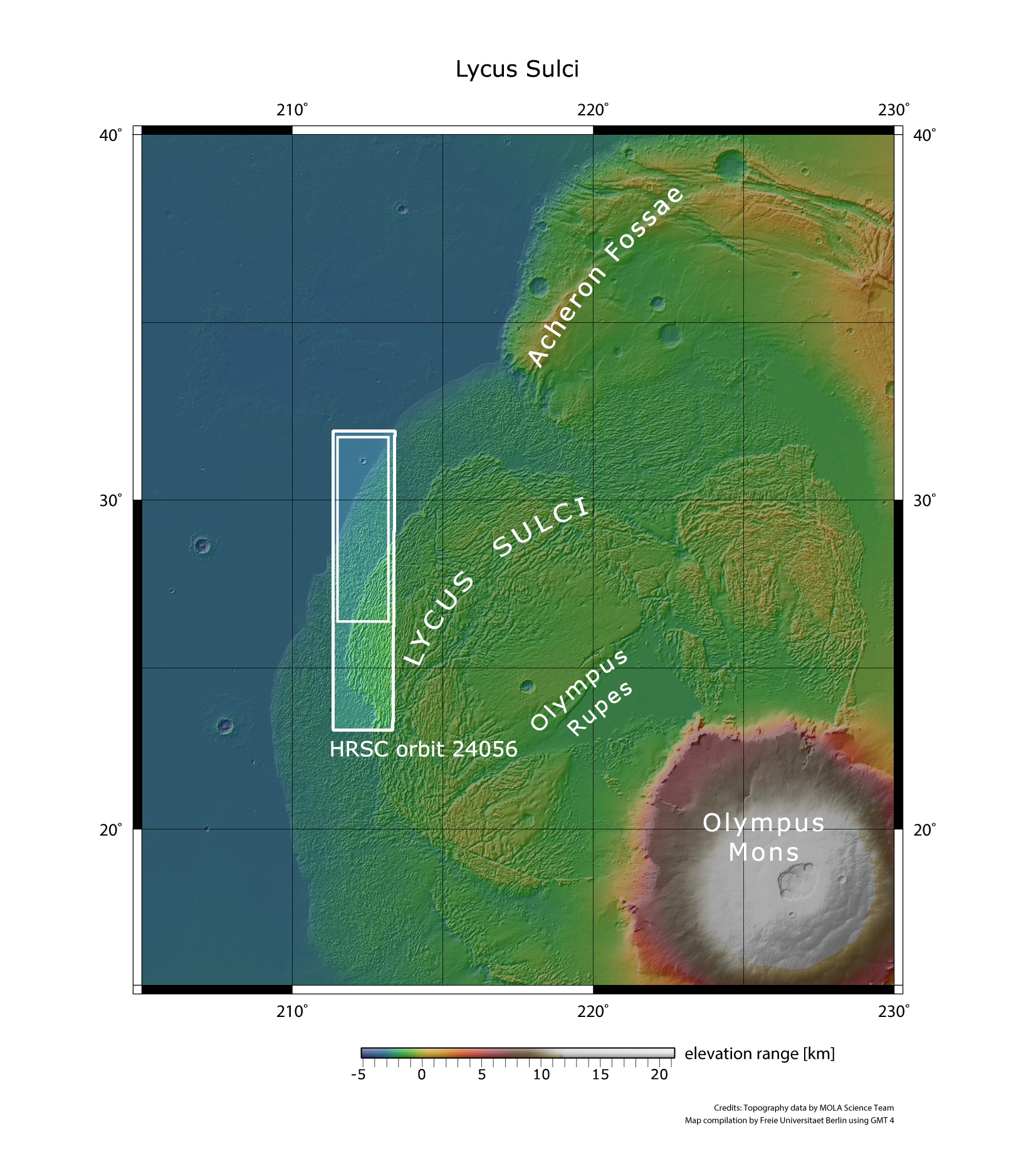 Am 18. Januar 2023 hat die ESA-Raumsonde Mars Express während Orbit 24056 die Region Lycus Sulci überflogen, eine Region im Nordwesten des Olympus Mons. Sie ist von Hügelketten geprägt, die durch Bergstürze und Hangrutschungen entlang der Basis des knapp 22 Kilometer hohen Vulkans entstanden sind. Der originale HRSC-Bildstreifen ist etwa 95 Kilometer breit (äußeres Rechteck). Die in dieser Bildveröffentlichung gezeigten Landschaften befinden sich in dem inneren Rechteck in der nördlichen Hälfte des Gesamtbildes.