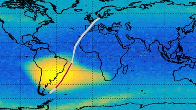 Daten des DLR-Satelliten Eu:CROPIS zeigen beispielhaft in 600 Kilometern Höhe die Südatlantische Anomalie (gelb). Die Flugroute führte in 13 Kilometern Höhe direkt durch diesen geografischen Bereich (rot markiert). In der Mission Atlantic Kiss hat ein Forschungsteam des DLR-Instituts für Luft- und Raumfahrtmedizin die kosmische Strahlung auf Reiseflughöhe gemessen.