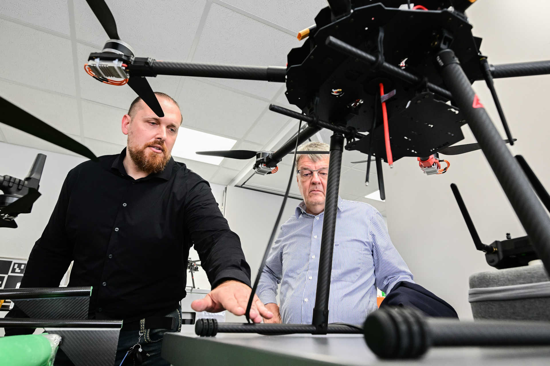 Ein Mitarbeiter des DLR-Instituts für den Schutz terrestrischer Infrastruktur, erklärt MdB Houben die Einsatzmöglichkeiten der Drohne.