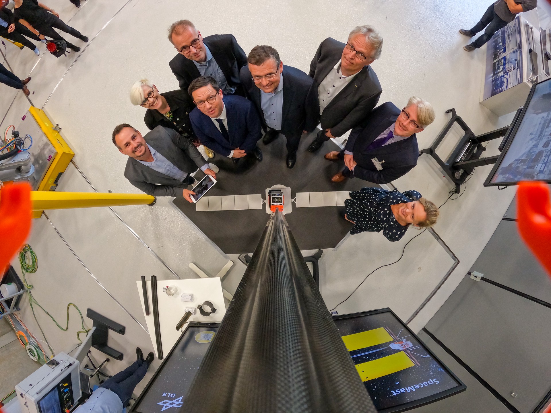 Eine Station des Rundgangs von Minister Mohrs am DLR-Standort Braunschweig war der SpaceMast. Als ausfahrbares modulares und ultraleichtes Mastsystem bietet es sich für vielseitige Weltraumanwendungen wie etwa als Träger von Instrumenten, Solarpanelen, Sonnen- und Bremssegeln an Satelliten, Raumschiffen oder Raumstationen an. Von links: Dr. Martin Zander, DLR-Institut für Systemleichtbau, Prof. Dr.-Ing. Anke Kaysser-Pyzalla, Vorsitzende des DLR-Vorstands, Falko Mohrs, Niedersachsens Minister für Wissenschaft und Kultur, Mark Schmidt, Leiter der DLR-Standorte Mitte, Dr. Peter Wierach, stellvertretender Direktor des DLR-Instituts für Systemleichtbau, Prof. Dr.-Ing. Karsten Lemmer, DLR-Vorstandsmitglied für Innovation, Transfer und wissenschaftliche Infrastrukturen, Dr. Marcus Beiner, stellvertretender Leiter der Abteilung Forschung, Innovation, Europa im niedersächsischen Ministerium für Wissenschaft und Kultur, und Birgit Pattberg, Leitung Geschäftsfeldentwicklung und -support im DLR