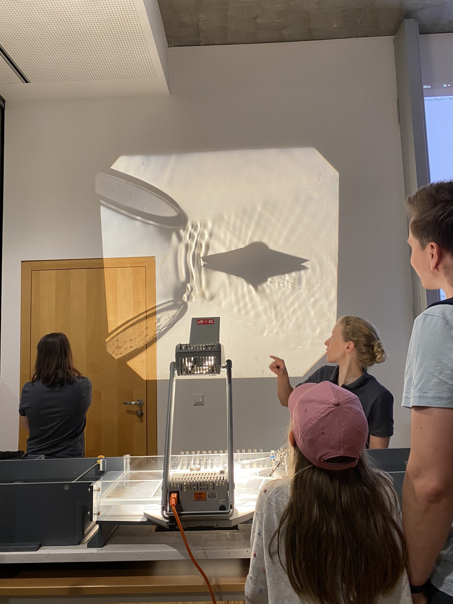 Im Flachwasserkanal wurden Strömungsphänomene an Tragflächenprofilen, Autos und Lastkraftwagen oder auch dem DLR-Logo sichtbar gemacht.
