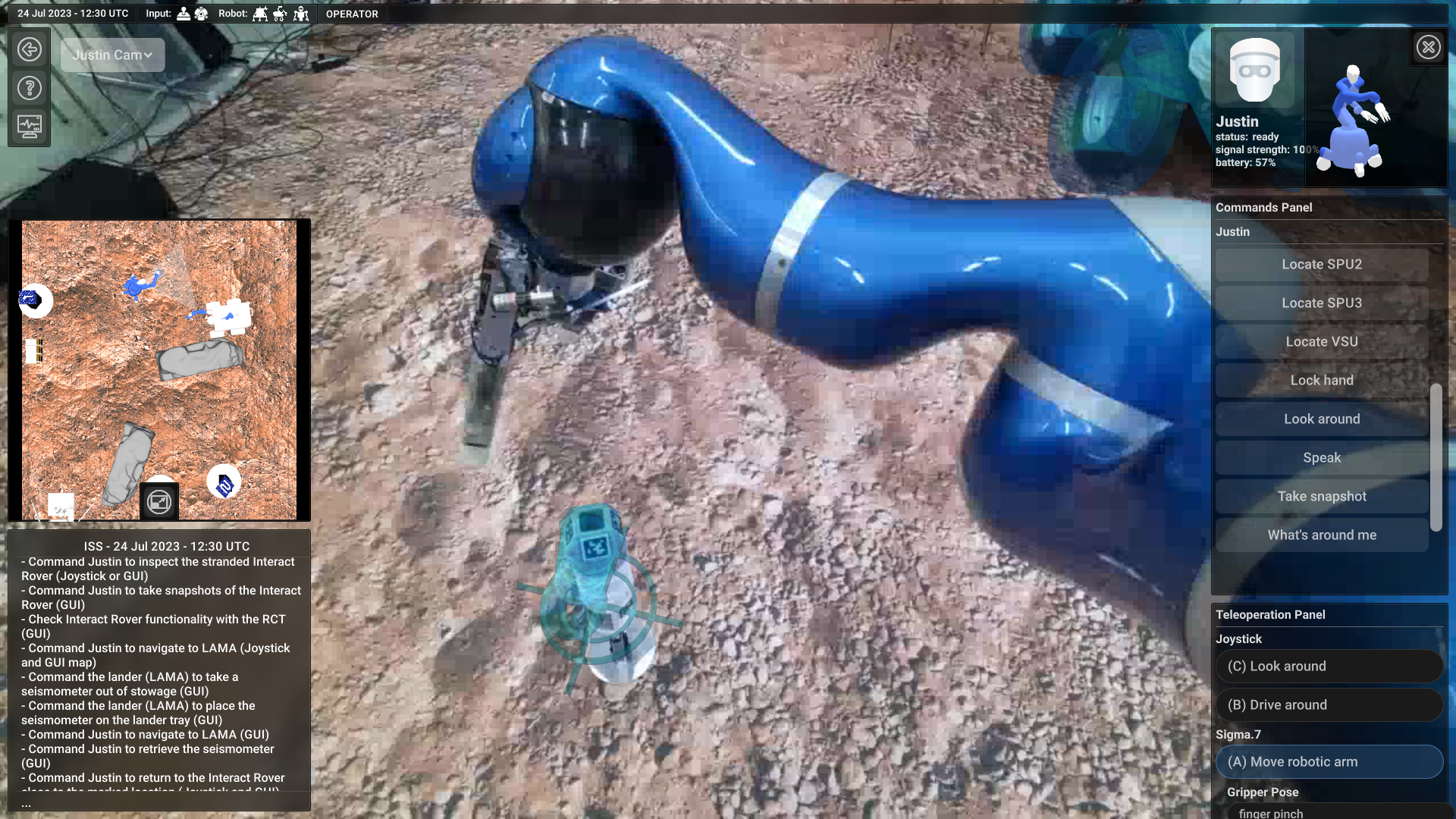 Die Surface Avatar-Experimente machen es möglich, dass NASA-Astronaut Frank Rubio die Welt aus den Augen eines Roboters sehen kann. Das Bild zeigt die Perspektive des humanoiden DLR-Roboters Rollin‘ Justin, wie er ein Seismometer auf den Boden stellt. Zur Orientierung im Raum hat er im linken Bildrand eine kleine Karte. Auf der rechten Seite sind die Kommando-Optionen, die der Roboter in Oberpfaffenhofen vom Astronauten an Bord der ISS erhält.