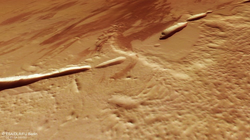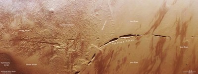 Neue Bilddaten der hochauflösenden Stereokamera (HRSC) an Bord der ESA-Mission Mars Express zeigen den nördlichen Teil der Aganippe Fossa am Fuße des Vulkans Arsia Mons. HRSC ist ein Kameraexperiment, das vom Deutschen Zentrum für Luft- und Raumfahrt (DLR) entwickelt wurde und betrieben wird.