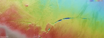 - Neue Bilddaten der deutschen Stereokamera HRSC an Bord der Mission Mars Express zeigen ein Gebiet in der Nachbarschaft des Vulkans Arsia Mons.