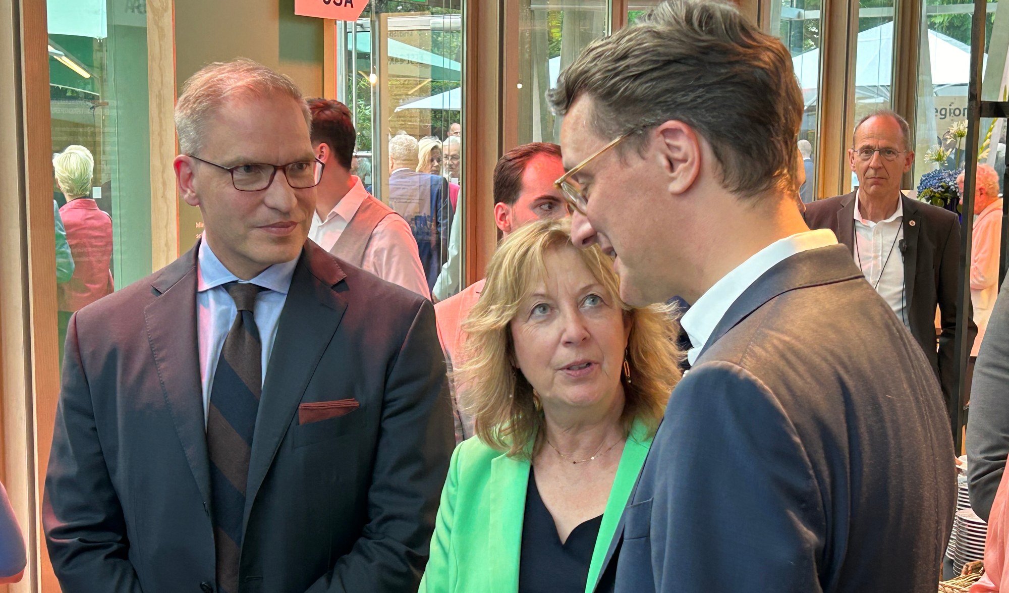 Prof. Jens Jordan, Leiter des DLR-Institutes für Luft- und Raumfahrtmedizin und seine Stellvertreterin Dr. Ruth Hemmersbach erläutern Ministerpräsident Wüst, welche Strahlenbelastung bei einem Flug zum Mond für die Raumfahrenden entsteht.