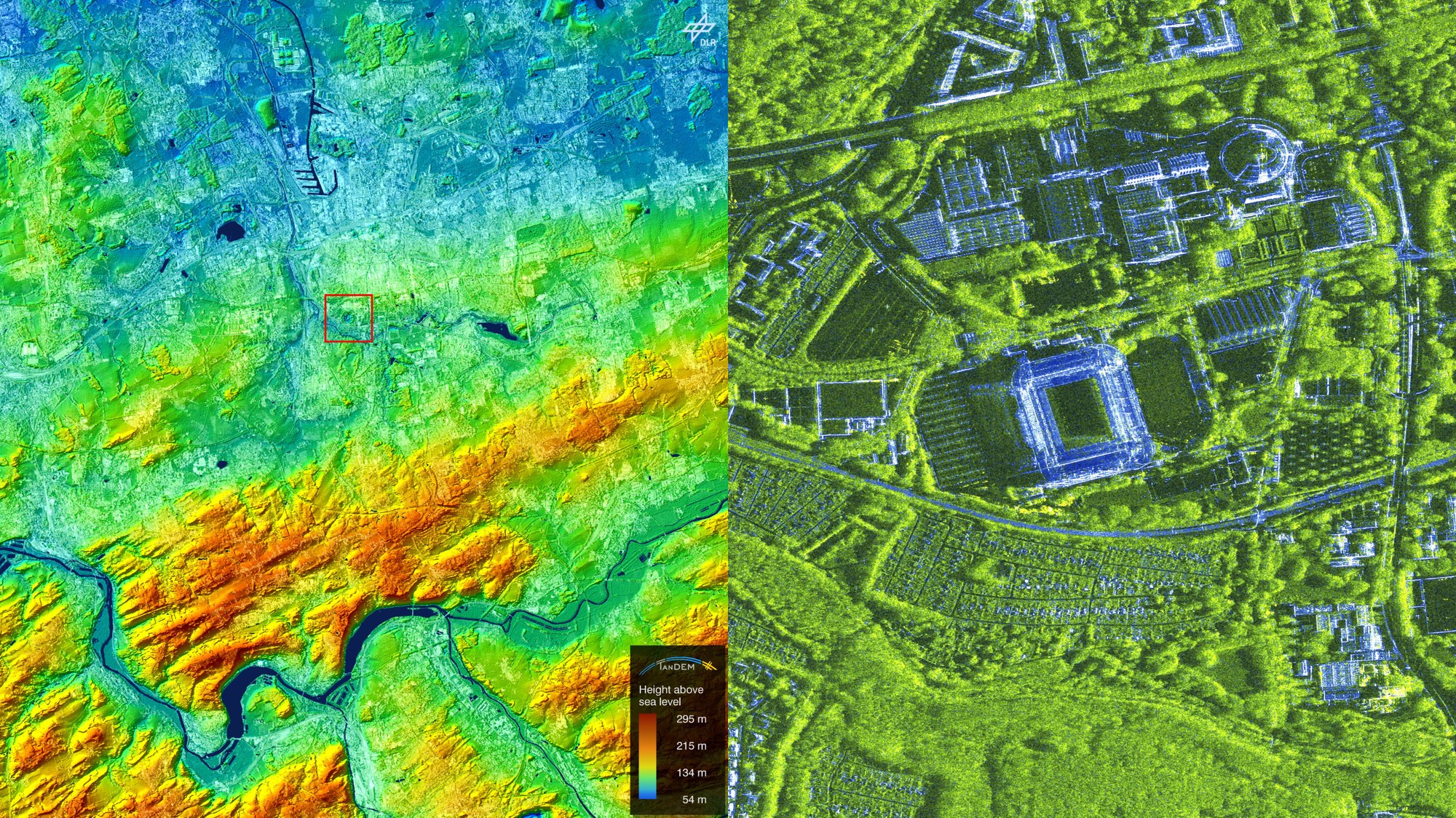 Das Höhenmodell links mit dem Stadion im Zentrum zeigt die Innenstadt von Dortmund auf der leichten Erhebung nördlich des Stadions und südlich des Hafens. Südlich von Dortmund erstreckt sich das Ardeygebirge. An dessen unterem Rand fließt die Ruhr von Ost nach West mit dem Hengstey- und dem Harkort-Stausee.