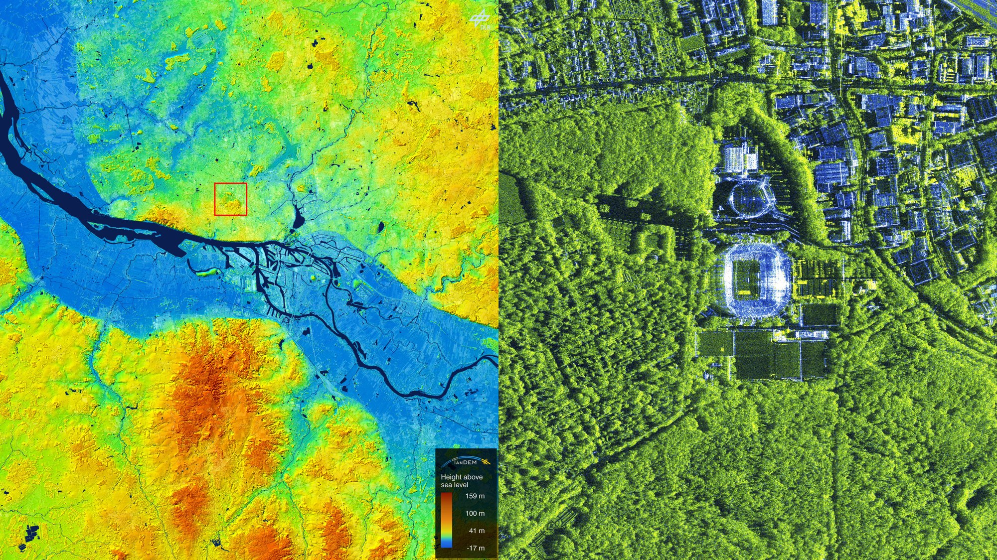 Im Höhenmodell links ist das Tal der Elbe, die von Ost nach West fließt, sowie die Hafenanlagen in Hamburg klar erkennbar. Südlich des Elbtals erhebt sich die Nordheide rund um Buchholz, östlich und westlich begrenzt von der Seeve und der Este.