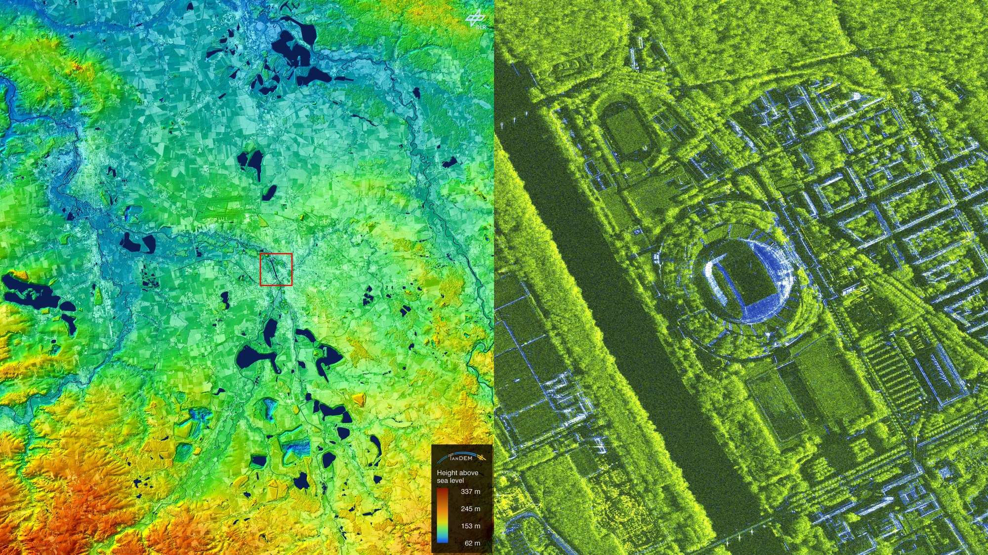 Im Höhenmodell links sind die Spuren des Bergbaus südlich von Leipzig klar erkennbar, mit gefluteten und noch aktiven Tagebauen.