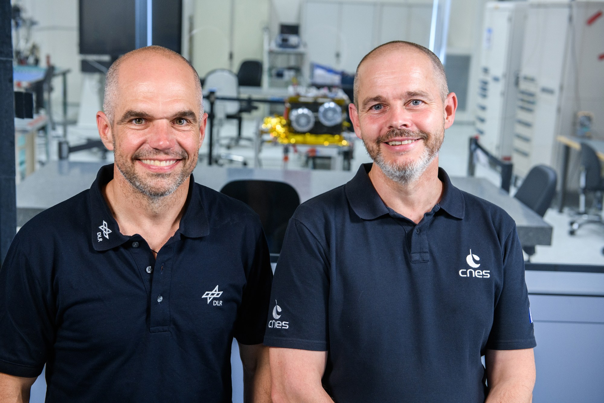 Von links: Zusammen haben Markus Grebenstein vom DLR-Institut für Robotik und Mechatronik und Stéphane Mary von der französischen Raumfahrtagentur CNES die Projektleitung für den Marsmond-Rover IDEFIX inne. Hier sind sie mit IDEFIX im Hintergrund am CNES-Standort Toulouse zu sehen.